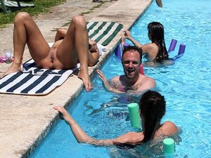 Impreza przy basenie z ciekawym zwrotem akcji. Dziewczyny pieprzyły tego samego kolesia przy basenie, dotykając cipek