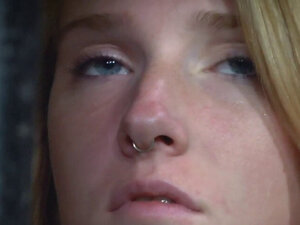 Zawieszona blondynka jest bita w lezdom. Gorąca zakneblowana blond niewolnica Dahlia Sky jest ubrana i dostaje twardy bicz, a potem lezdom Claire Adams chłosta ją i wibruje jej cipkę, gdy jest zawieszona na hogtie
