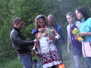 Biusta blondynka w analnym gangbang międzyrasowym. Przed imprezą blondynka z dużymi cyckami, Britney Amber, dostaje rozerwaną sukienkę z kwiatami, a potem grupa ogromnych kutasów facetów w analnym gangbang, międzyrasowy orgia, pieprzyła ją