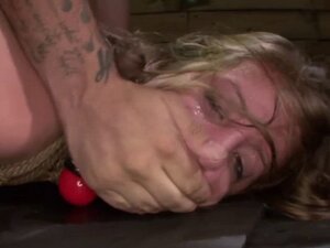 Zakneblowany busty brunetka niewolnik Serena Blair z rękami w pudełku krawat dostaje kijami i zrobił chodzenie na kroczu liny przez szorstki mistrz sierż Major na hogtie