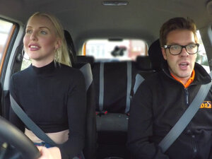 Napalona blondynka w fałszywym samochodzie do jazdy na uczelni zatrzymuje się i ssie dużego kutasa swojemu instruktorowi, a potem pieprzy go na tylnym siedzeniu, gdy cctv jest włączone